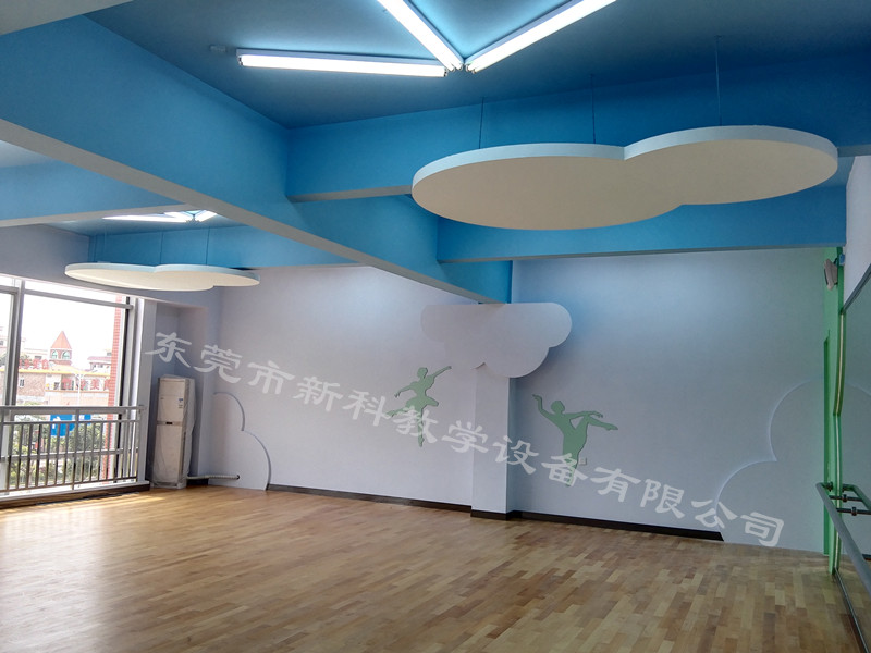 學(xué)校舞蹈室采用天藍(lán)色的天花,藝術(shù)墻紙為裝修風(fēng)格,優(yōu)美的空間環(huán)境給師生帶來輕松愉悅的心情,在翩翩起舞的同時還收獲一份美好的心情,通過舞蹈社團(tuán)課使學(xué)生學(xué)會有關(guān)舞蹈的技能在實踐活動中不斷的提煉情感,增強技藝提高對藝術(shù)作品的理解力,表現(xiàn)力、想象力和創(chuàng)作力,努力為校園文化增添光彩,并力創(chuàng)建學(xué)校特色添磚加瓦。