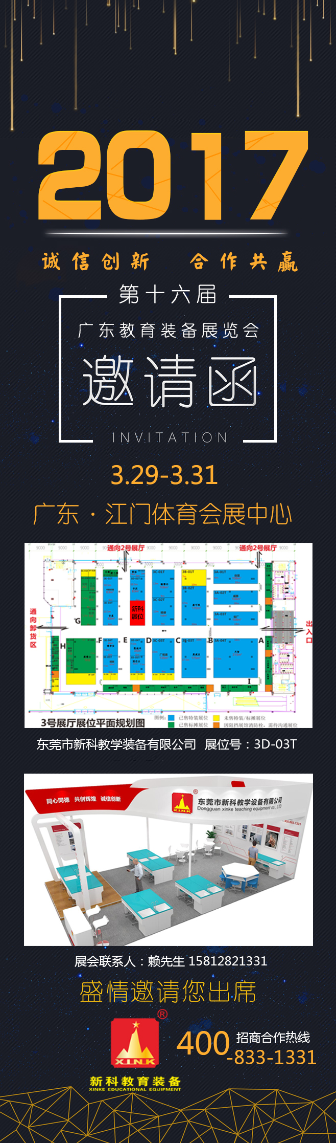 2017年3月29日至31日,由第十六屆廣東教育裝備展覽會暨第二屆江門·臺灣教育裝備展覽會,新科將攜帶一系列未來創(chuàng)客教室、創(chuàng)新實(shí)驗(yàn)室產(chǎn)品、機(jī)器人、3D打印機(jī)、VR、數(shù)字書法室解決方案亮相該展會,展位號為3D-03T。誠邀蒞臨各界朋友及新老客戶前來參觀指導(dǎo)。